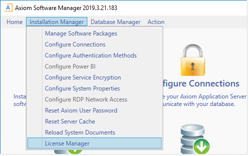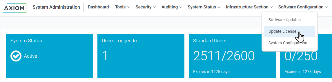 If needed, you can use the Axiom Software Manager on the Axiom Application Server to update the license file. This activity requires administrative permissions on the server, and is typically performed by your Information Technology department. You will need to provide your IT department with the license file provided to you by Axiom Support.