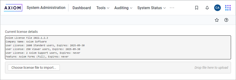 Axiom Support will provide you with a new license file if your organization has licensed new features, products, or users, or if your current license has been renewed. The new license file must be imported into Axiom Financial Planning in order to take effect.