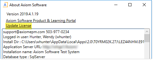 In the About Axiom Software dialog, click the Update License link at the top of the dialog.