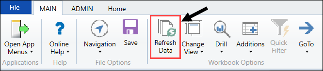 • In the Main ribbon tab, access the Workbook Options group and click Refresh Data.