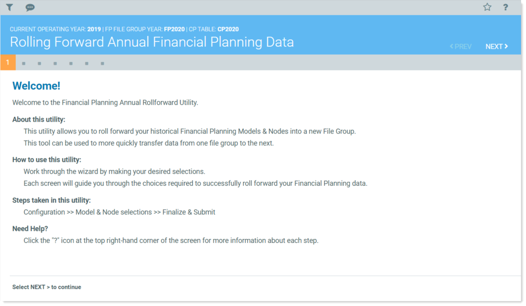 The utility is a user-friendly wizard that walks step-by-step through the process of pulling data from the Current Year file group and importing it to the Next Year file group.
