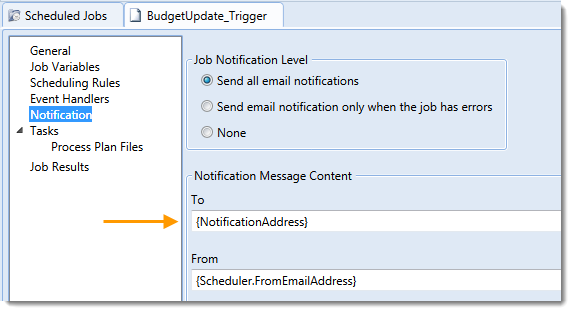 NOTE: Currently, these file group notification addresses are only for use with triggers. The Scheduler job will only be able to resolve the {NotificationAddress} variable if the job was executed in response to a file group trigger.