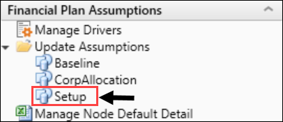 1. In the Fin Plan Admin task pane, in the Financial Plan Assumptions section, click the Update Assumptions folder, and double-click Setup.