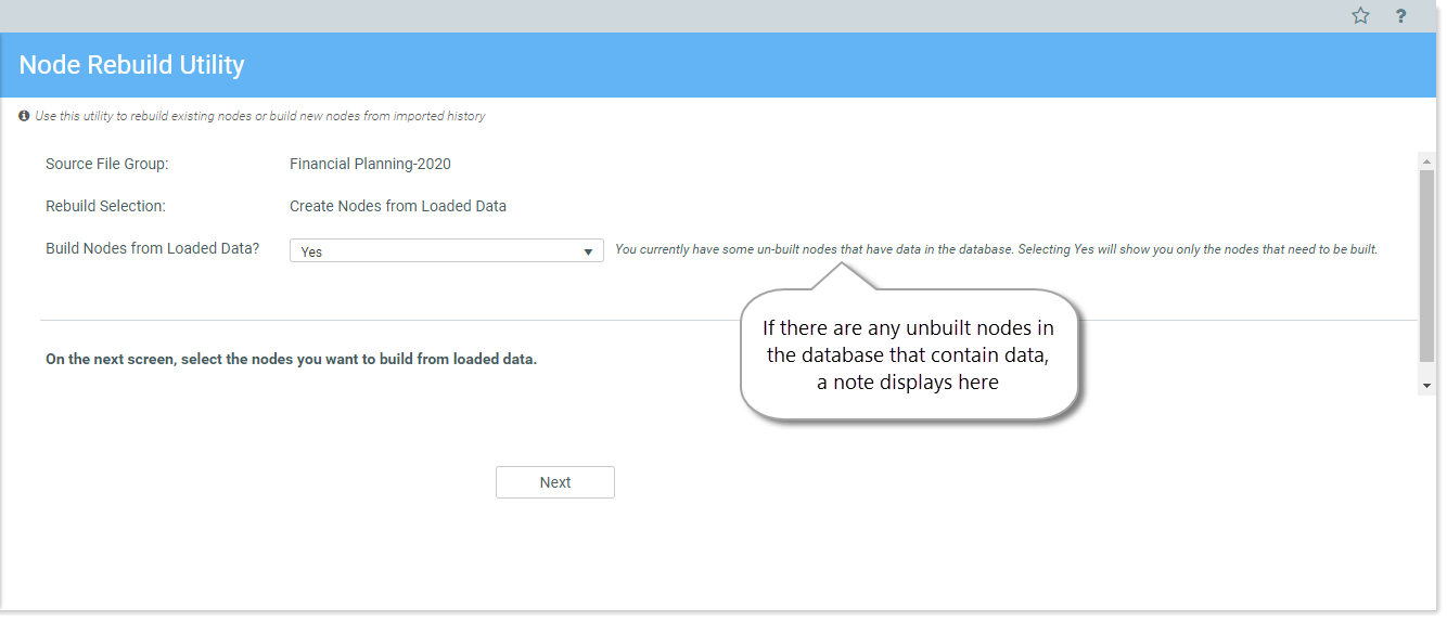 In the Node Rebuild Utility, from the Build Nodes from Loaded Data drop-down, select Yes, and then click Next.