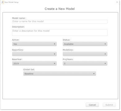 ReportGrp (optional) Select the report group to assign the model to. ModelGrp (optional) Select the model group to assign the model to. BaseYear Select the current operating year to associate to the model. ProjYear Select the number of years to calculate for projections. Global Set Select the default set of assumptions (For example, inflation rates, volume changes) used by nodes assigned to this model.