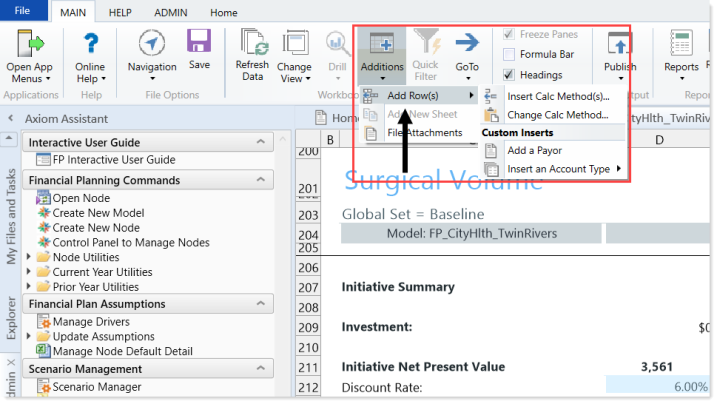 To insert additional input rows within a node, in the Main ribbon tab, in the Workbook Options group, click Additions > Add Row(s).