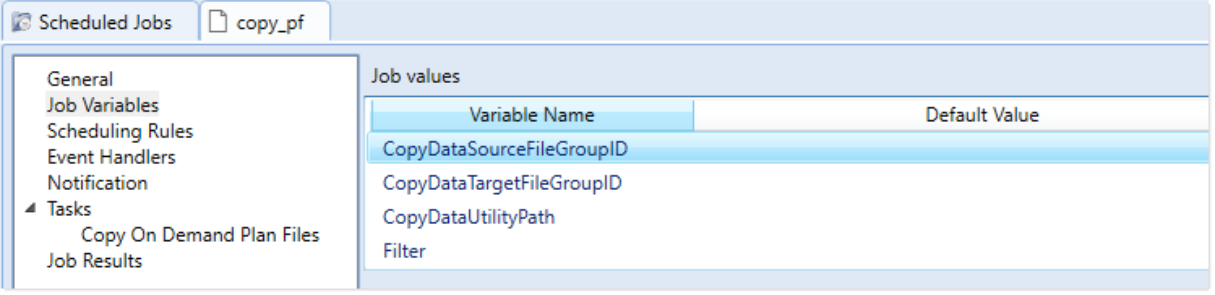 Add the variables that you want to use to the Job Variables tab. For example, if you want to override the source and target file groups, the copy data utility, and the plan file filter, add those variables to the Job Variables tab. You do not need to add a variable name if you do not plan to override it.