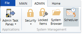 In systems with installed products, this feature may be located on the Admin tab. In the System Management group, click Scheduler.