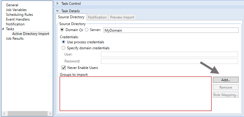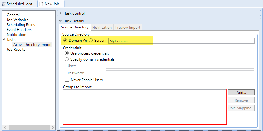 This completes the settings for the Active Directory Import task. However, there are a few general job properties that should also be reviewed and completed as needed.