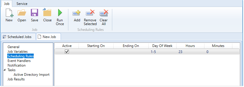 11. In the left-hand pane, click Scheduling Rules. Using this section, you can define a scheduling rule so that the job runs automatically as needed. Typically, organizations want the Active Directory Import task to run regularly so that users are kept in sync.