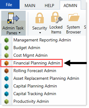 For administrators, in the Admin ribbon tab, click Admin Task Panes, and select Financial Planning Admin.