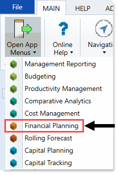 For end users, in the Main ribbon tab, click Open App Menus, and select Financial Planning.
