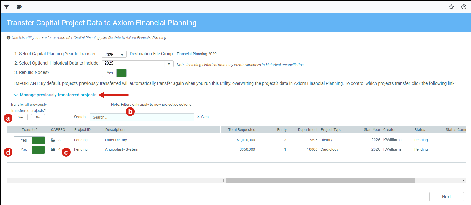Click Next to Select capital projects for transfer.