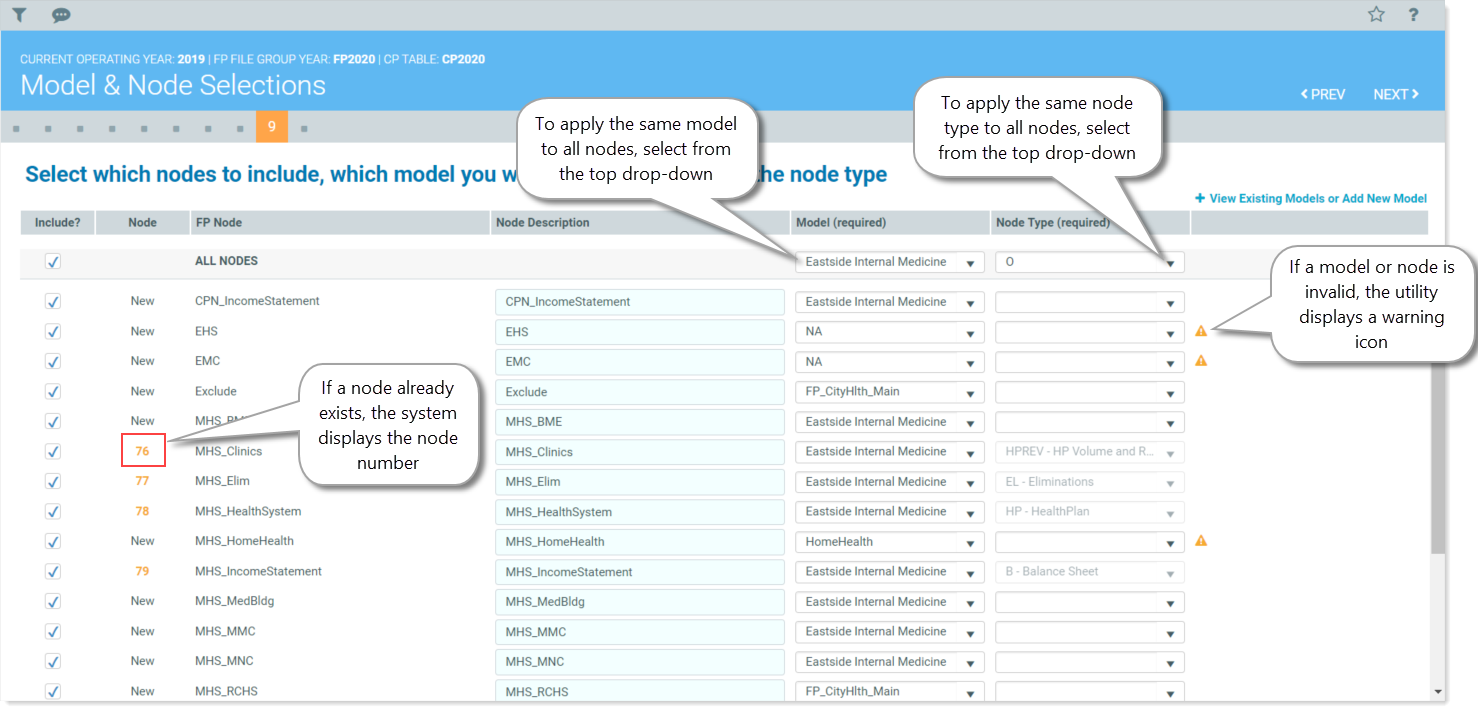 On the Models & Node Selections page of the Transfer to Financial Planning utility, select the nodes to include, the models to save data to, and the node types.