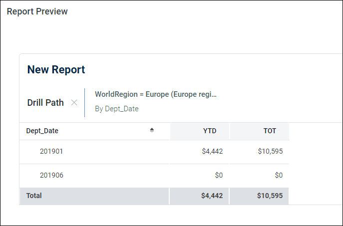 The current drill path appears along the top of the page. The drill path identifies the row that was drilled and the current drill level. If you have drilled the drill results, the previous drill levels also appear in the drill path. Click a previous drill level to return to that level or you can click the Close X icon to clear the drill and return to the original report grid.