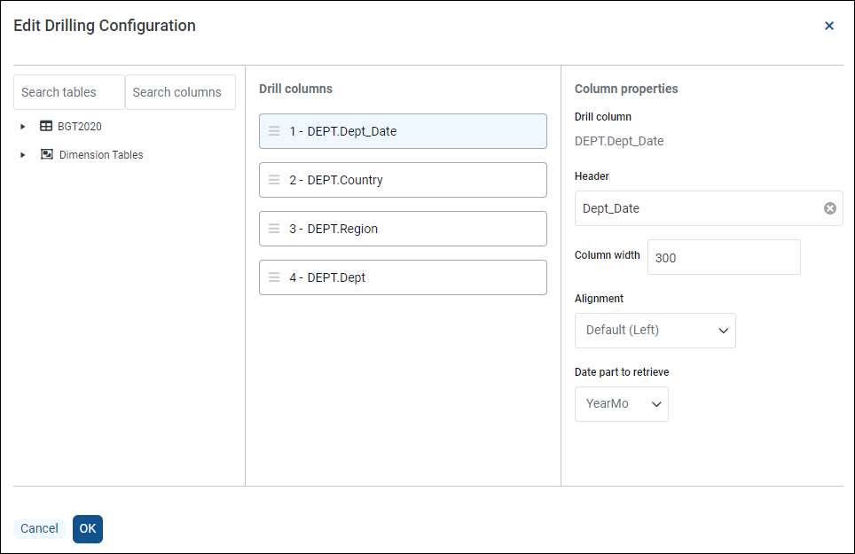 Drag columns from the table tree to the Drill Columns area in the middle of the dialog. The available columns for drilling depend on the table specified as the primary table for the data context: