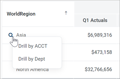 Directed: Drill to view the underlying data based on predefined drilling paths. The report designer defines the available drilling paths and can configure certain display attributes for the drill.