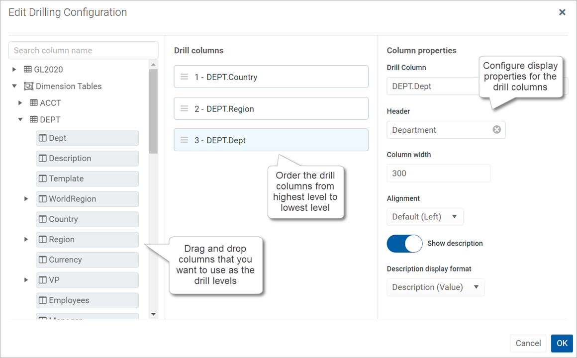 Select each drill column and configure the drill properties in the right side of the dialog. See the following table for information about these properties.