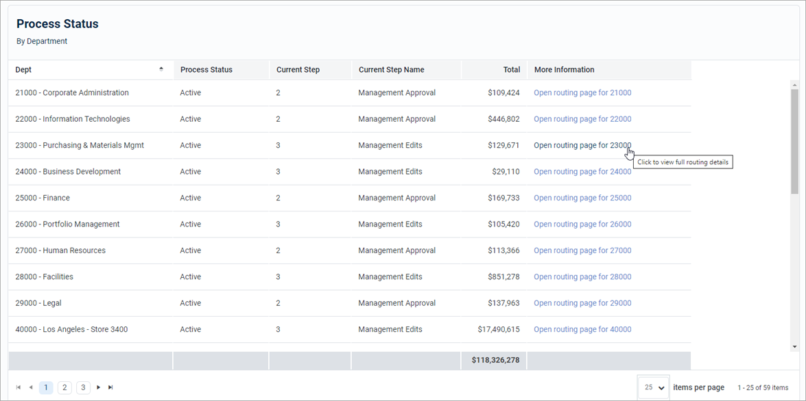 The URL to link on each row. The URL must be to a relative location within the Axiom Financial Planning system. When viewing the report, the full URL is generated by appending the relative URL to the current Axiom Financial Planning system address. To make the link dynamic, use the Insert Variable menu above the box to insert a variable for use within the URL. For more information, see Use variables in the link properties. For example, imagine that the report contains the key column of a plan code table (such as Dept or CapReq) and you want each plan code to link to the Process Routing page for a particular plan file process. The full URL to the Process Routing page uses the following syntax: https://mycompany.axiom.cloud/process/processdefinitionID/planfile?planvalue=plancode The process definition ID is constant for the URL but the plan code value needs to be the current row's department value. Use the /process/16682/planfile?planvalue={value} NOTE: Enter the relative URL with or without the beginning forward slash. When viewing the report, the column resolves to use the full URL with the current column value. For example, the row showing Dept 22000 has the following URL: https://mycompany.axiom.cloud/process/16682/planfile?planvalue=22000 When you click the hyperlink in this row, the Process Routing page for Dept 22000 appears for the plan file process associated with process definition ID 16682. NOTE: The URL property only appears if the specified link type is custom or if the Link type option does not exist because all links in the report are custom. When using the plan file link type, the URL to the plan file is automatically generated by Axiom Financial Planning. |