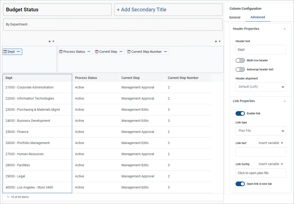 In the following example, you enable the Dept column to contain hyperlinks to plan files. You leave the Link text field blank to use the column values in the Dept column, which you configured to show descriptions.