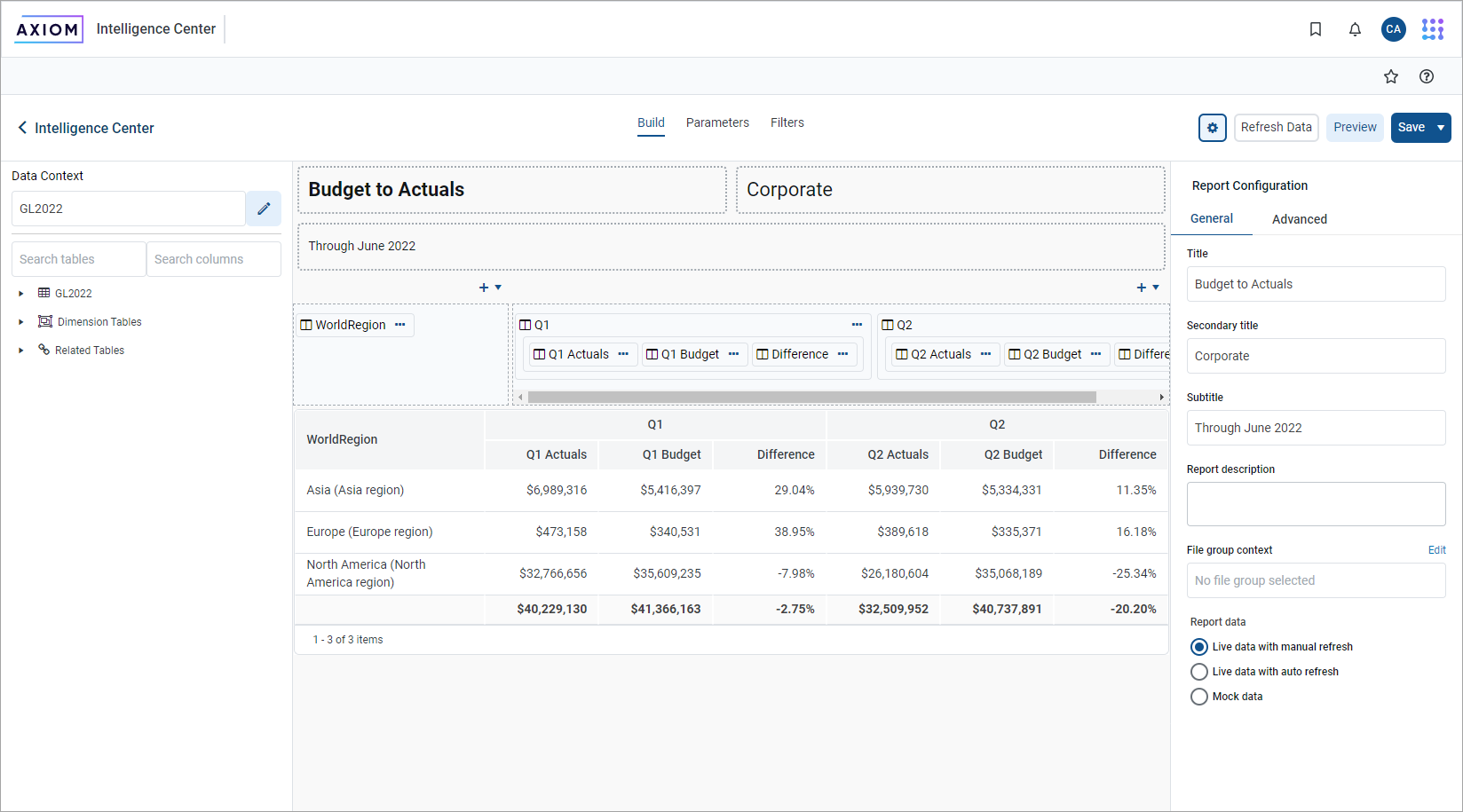 To access the Report Configuration pane, select the Build tab in the Report Builder and then click the gear button in the top right. The pane is organized into two tabs, General and Advanced.