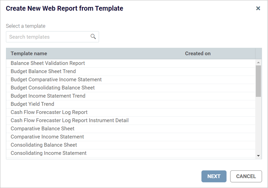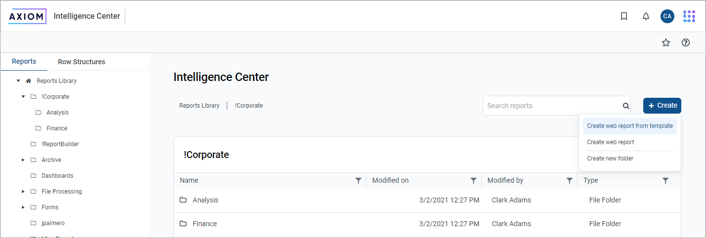 To create a web report, you must be an admin or have the Create Web Reports security permission. To save the new report, you must have read/write access to at least one folder in the Reports Library or access to the My Documents folder. If you do not have permission to create web reports, the option to create a new web report from template is not available as Create is disabled in the Intelligence Center.