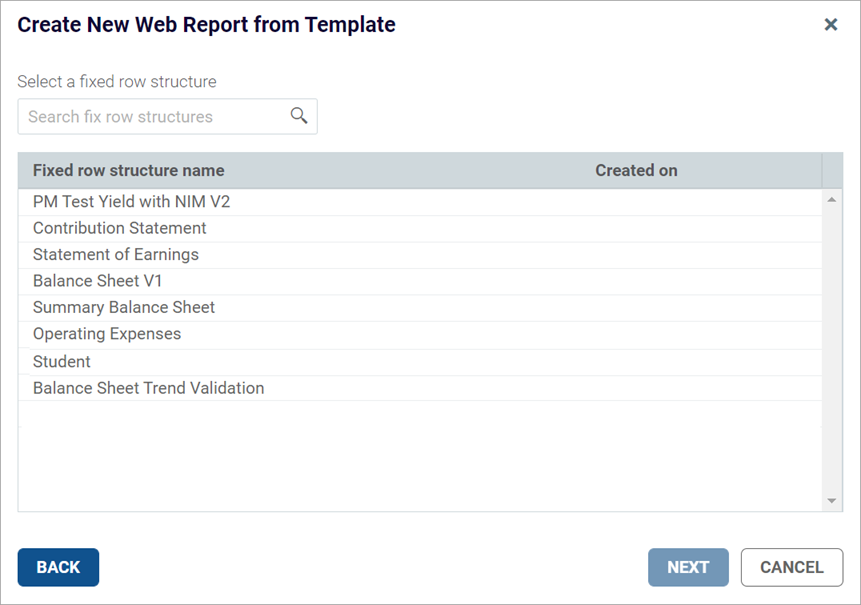 NOTE: If no fixed row structures are listed, your system does not have any available fixed row structures. You must create one before you can create a web report using the selected template. Click Back to select a different template, or click Cancel to exit the dialog and return to the Intelligence Center. For more information, see Manage fixed row structures for web reports.