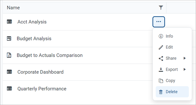 2. Hover your cursor over the row with the report, hover your cursor over the Name column to make the three-dots icon visible. Click the icon then select Delete from the menu.