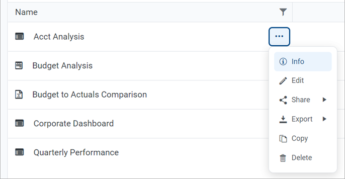 2. After the report is displayed in the Intelligence Center grid, hover your cursor over the Name column to make the ellipsis icon visible. Click the icon, and then select Info from the menu.