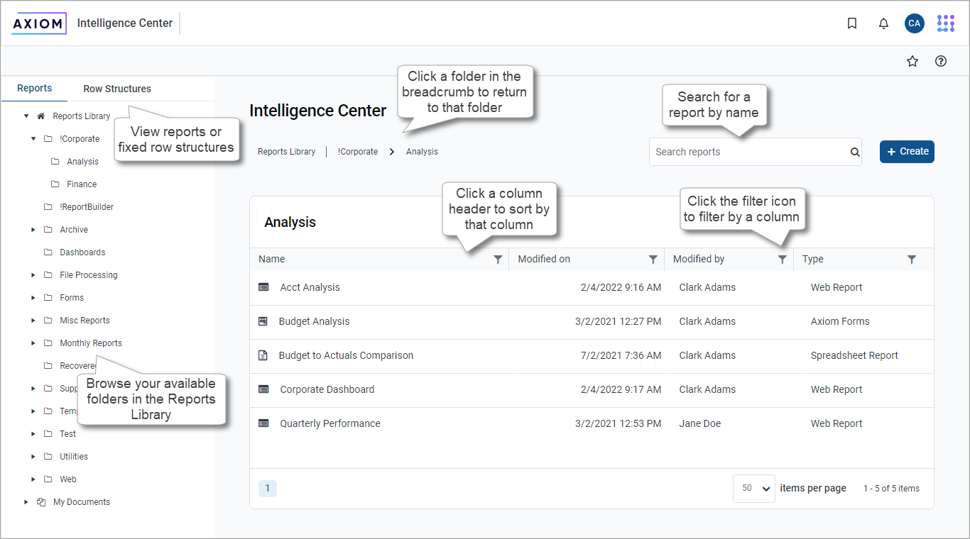 To search for an item by name, type search text into the Search box and click the magnifying glass or press Enter. The grid displays a list of all reports or fixed row structures that match your search text. You can open an item or perform other actions using this list. You can also filter and sort this list as described in the following sections.