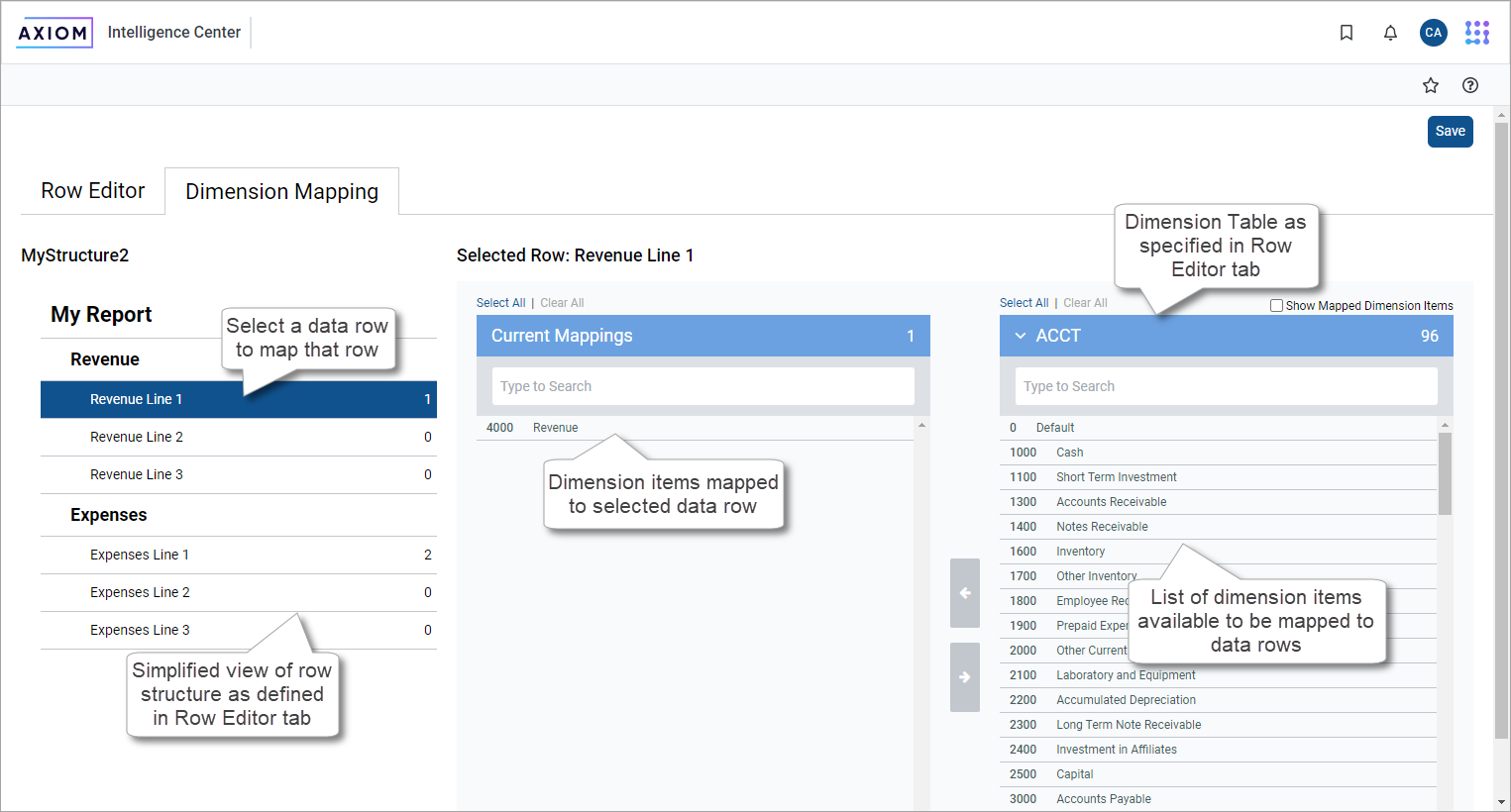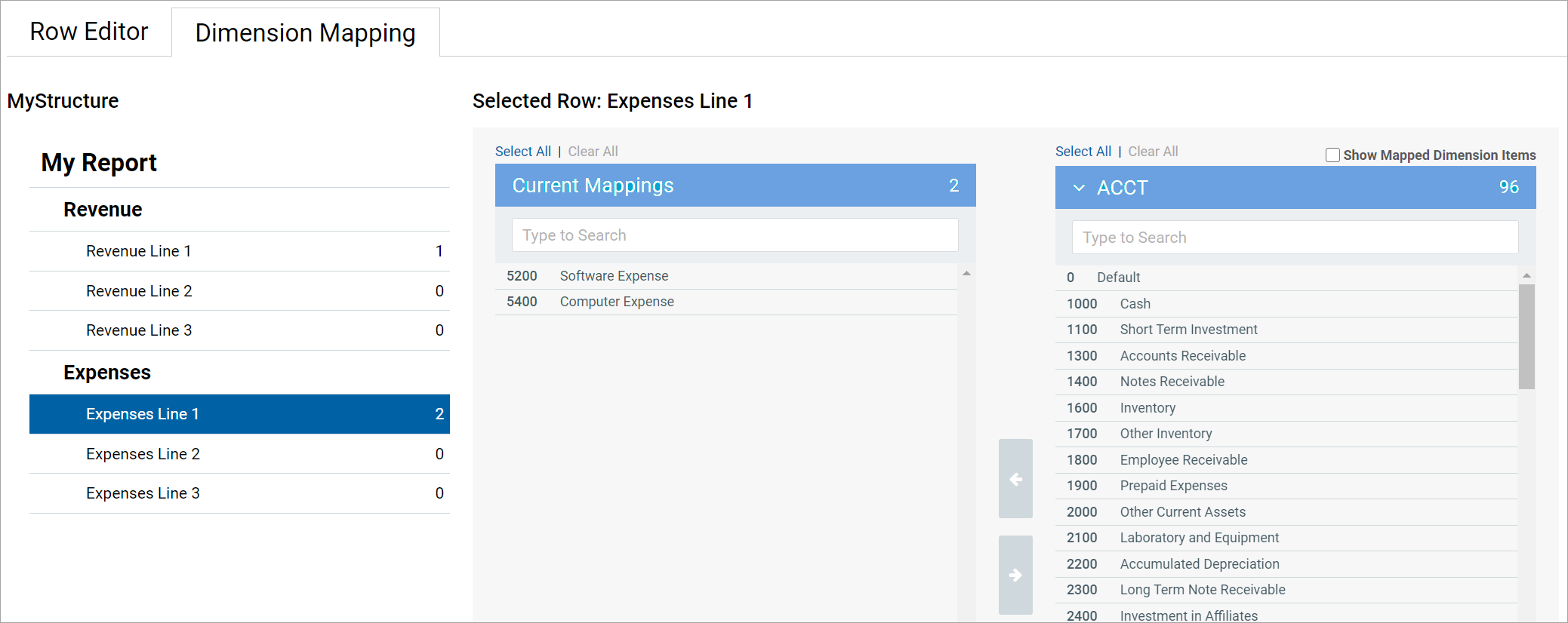 - The dimension column on the right side of the page shows the remaining unmapped dimension items. The dimension used for the mappings is determined by the specified Dimension Table in the Row Editor tab. In this example, the dimension table is Acct and the column shows the list of accounts defined in that table.