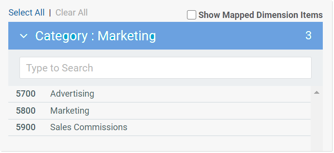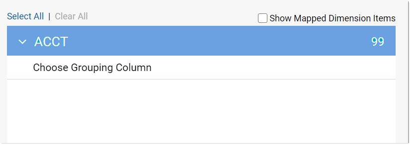 Select a grouping column so that the dimension column is filtered to only show values for a particular grouping. For example, you may have a grouping column of Category, which you can use to show accounts within a particular category—such as Revenue, Capital, or Marketing.