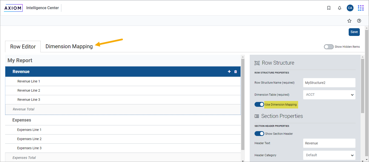 You can only access the Dimension Mapping editor when creating or editing a row structure. If you enable Use Dimension Mapping for the row structure, a Dimension Mapping tab appears next to the Row Editor tab. Click this tab to open the Dimension Mapping editor and assign dimension items to each row.