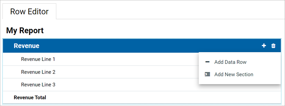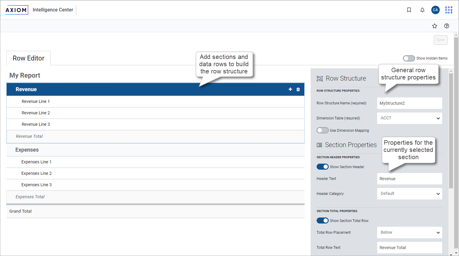 Using the Row Editor tab, build your row structure by adding, removing, or reordering sections. Each row structure starts with a top-level root section that includes an optional header and an optional grand total.