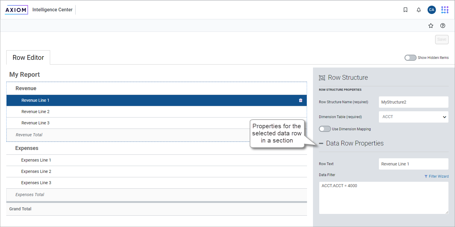 You can configure certain parts of the row structure as hidden, such as section header rows or total rows. By default, these hidden items no longer appear in the editor. If you need to view these items so that you can work with them and configure them, toggle the option Show Hidden items at the top right of the editor.