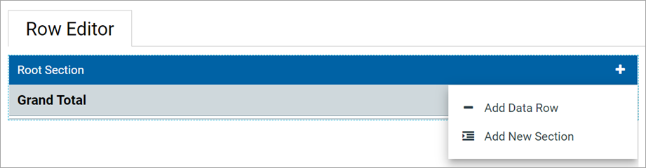 In the left row editor, add sections and data rows, as needed, to create the overall row structure. Think of the Root Section as the overall wrapper in which all row sections are placed. To create the first row section, click the plus icon + on the Root Section header and then select Add New Section.