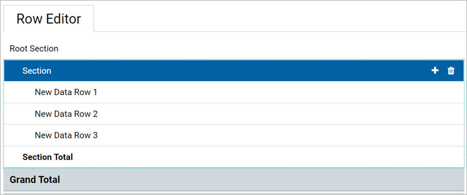 To add a section, select the section header to add the section, and then click the plus icon + > Add New Section. The new section is added as a subsection to the current section. By default, all new sections contain a section header row, three data rows, and a total row. Add or remove data rows, as needed.