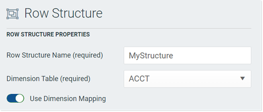 Enable this toggle switch to map specific items in the dimension table to specific rows in the structure. When using dimension mapping, all row data is defined at the key column level of the dimension table and each dimension item can only be assigned to a single row. The toggle switch is green when enabled and gray when disabled.