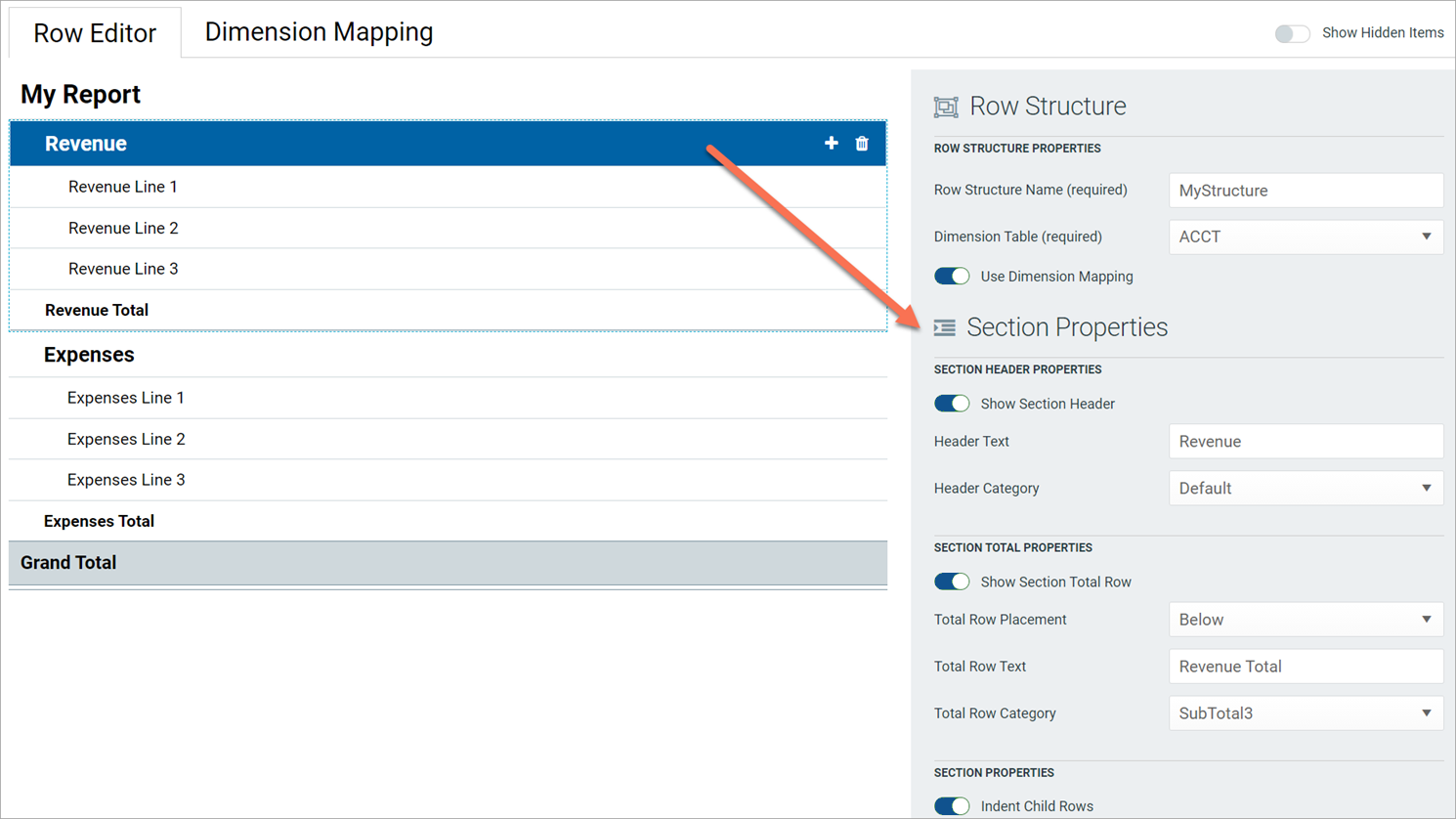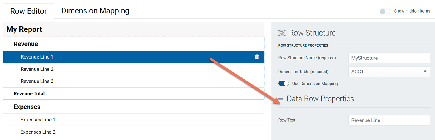 At minimum, the row properties define the label text for the row. If the structure does not use dimension mapping, the row properties also define a data filter to determine the data to be shown on the row. For more information about defining the row properties, see Row properties.