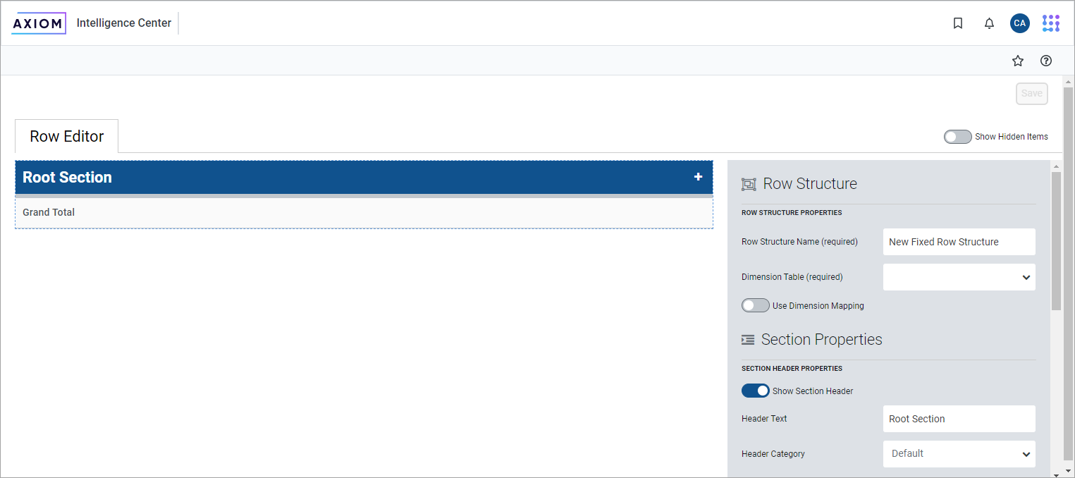 In most cases, the row structure immediately updates to reflect section properties that affect the display. For example, if you define header text, that text is immediately shown on the row structure. However, if you hide the section header row, the row continues to appear in the row structure unless you disable the option Show Hidden Items. This option is located at the top right of the row editor, under Save. By default, the row editor continues to show hidden section headers so that you can use the Add Data Row and Add New Section actions on the header row.