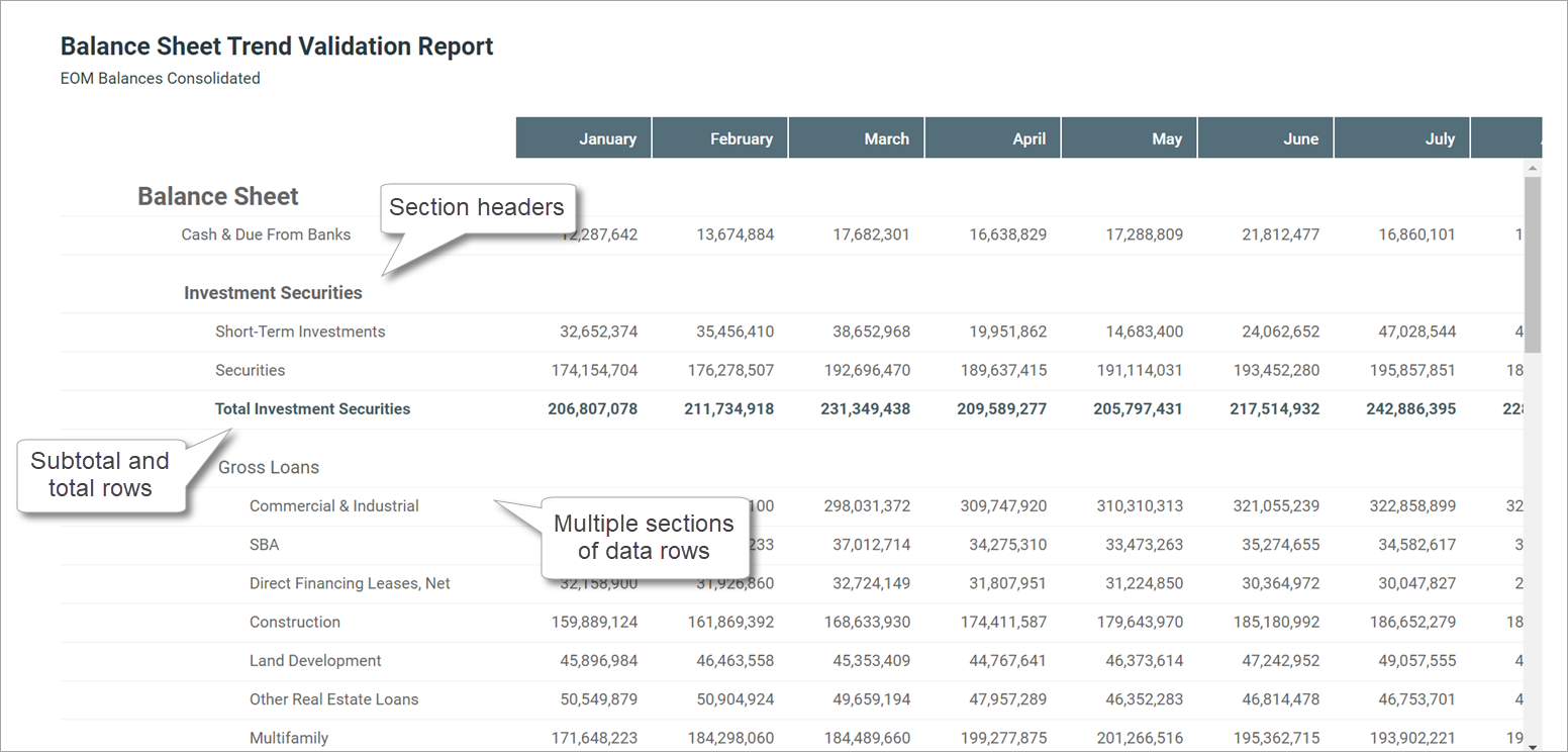 You can define as many different fixed row structures, as needed. Use a row structure with any web report where the structure's row dimensions are compatible with the report's columns, filters, drilling options, and any other report property that impacts queried data. Create, edit and delete row structures using the Intelligence Center.