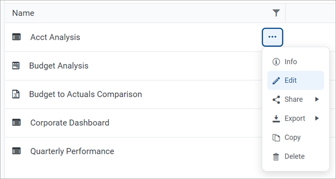 After the web report appears in the Intelligence Center grid, hover your cursor over the Name column to make the ellipsis icon visible. Click the icon and then select Edit from the menu.