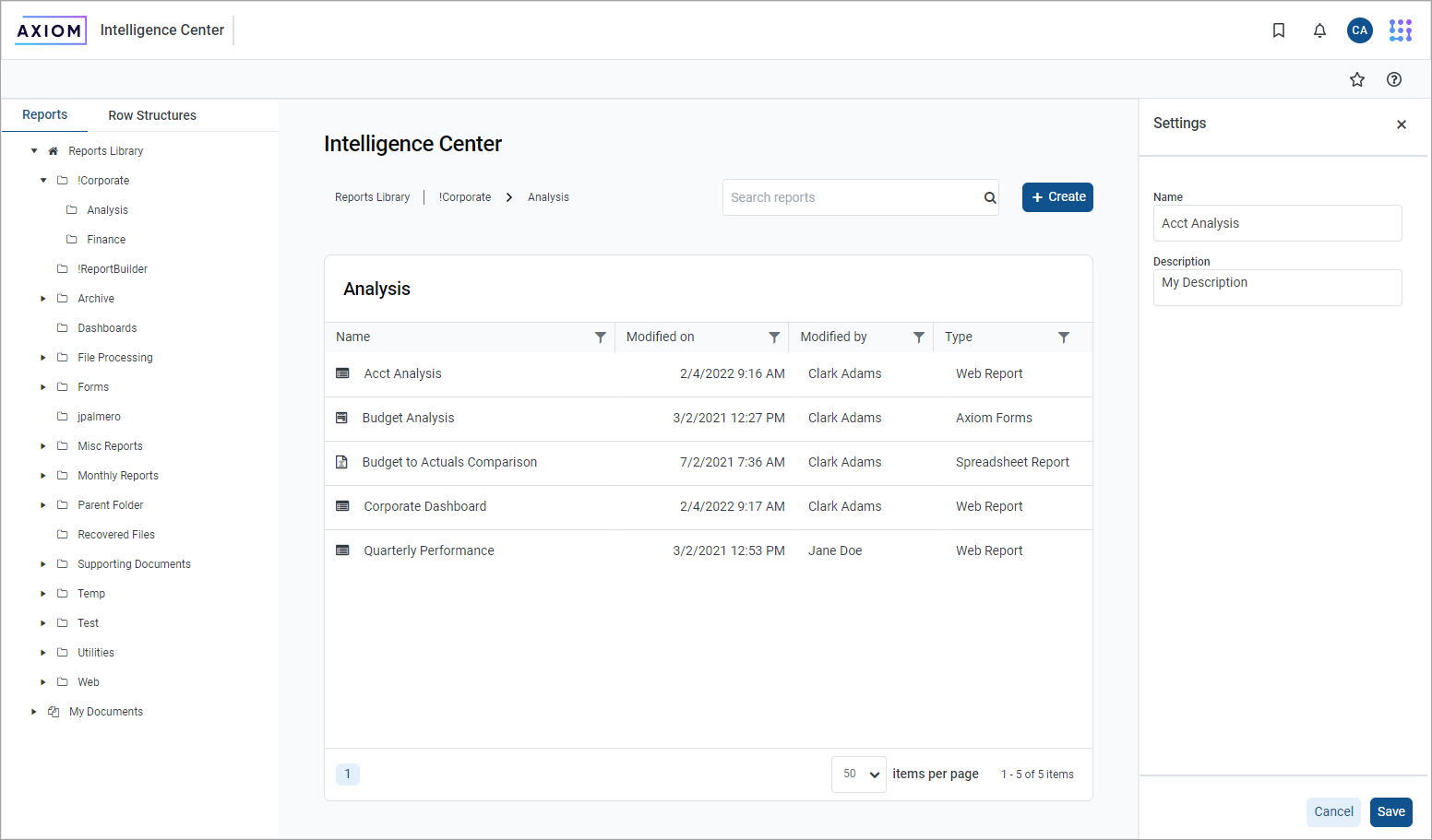 Using the Intelligence Center in the Axiom Financial Planning Web Client, you can create, edit, copy, and delete web reports, as needed. Web reports are designed to be intuitive for report builders to create and easy for report viewers to use.