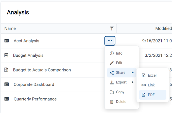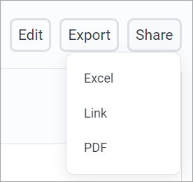 Hover your cursor over the Name column to make the ellipsis icon visible. Click the icon and select Share from the menu, and then select either Excel, Link, or PDF.