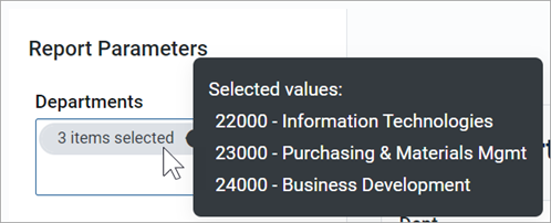 Select one or multiple values for each parameter depending on the parameter type and configuration. If a parameter allows you to select multiple values, the parameter box shows text, such as 3 items selected. Hover your cursor over this text to view the selected values in a tooltip.
