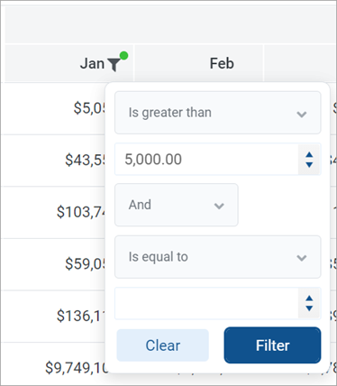 If the web report uses a data grid with dynamic rows, you can filter the report by the column data, (for example, to filter a column to hide zero-value records or show all records above or below a certain value). You can also filter a dimension column to hide or show certain dimensions (such as departments, accounts, and so on). The report designer determines whether a column is enabled for filtering.