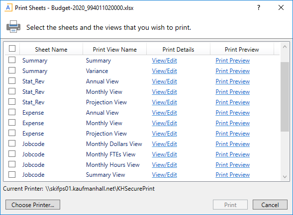 If you want to print all print views for all sheets, then select the check box in the column header to select all.