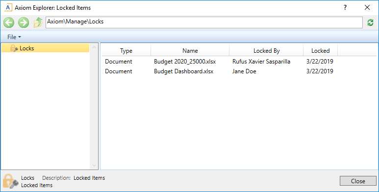 When users open files and tables in Axiom Budget Planning and Performance Reporting with read/write permissions, the item becomes "locked" to that user. Administrators can use Manage Locked Items to view a list of locked files and tables, and to remove locks if necessary.
