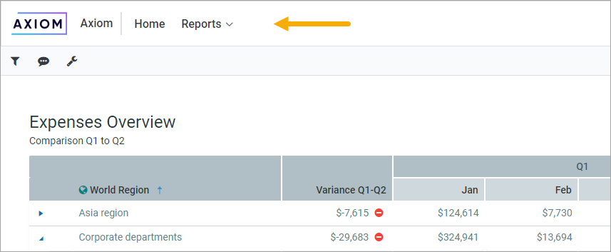 Axiom Budget Planning and Performance Reporting provides a set of standard navigation links by default for custom systems when you are in the Web Client. The standard navigation links can be customized, so each client's system may look different. Only administrators can customize navigation links using the Desktop Client. For more information about how to customize the panel, see Define content for the Web Client Navigation panel.