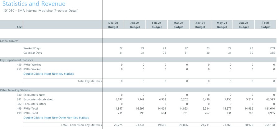 You can make adjustments in the Mar-Jun change for CY as well as % Adjust and Amt Adjust columns for NY Budget. Key statistics, such as patient days by Nursing unit, are defined in the Budget Statistics driverBudget Statistics driver.